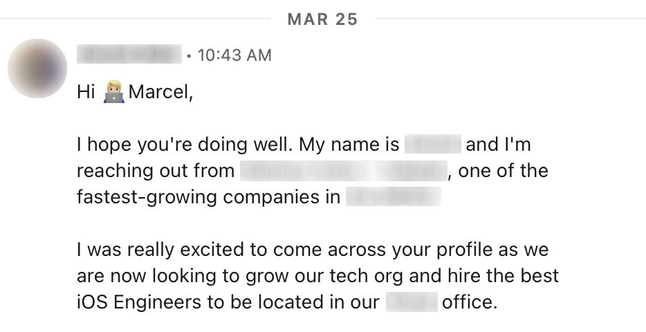 If any recruiter is reading this. Consider coming up with a genuinely personal message… or along with my affinity for automatization: Filter out any emojis automatically from their first name. 😉